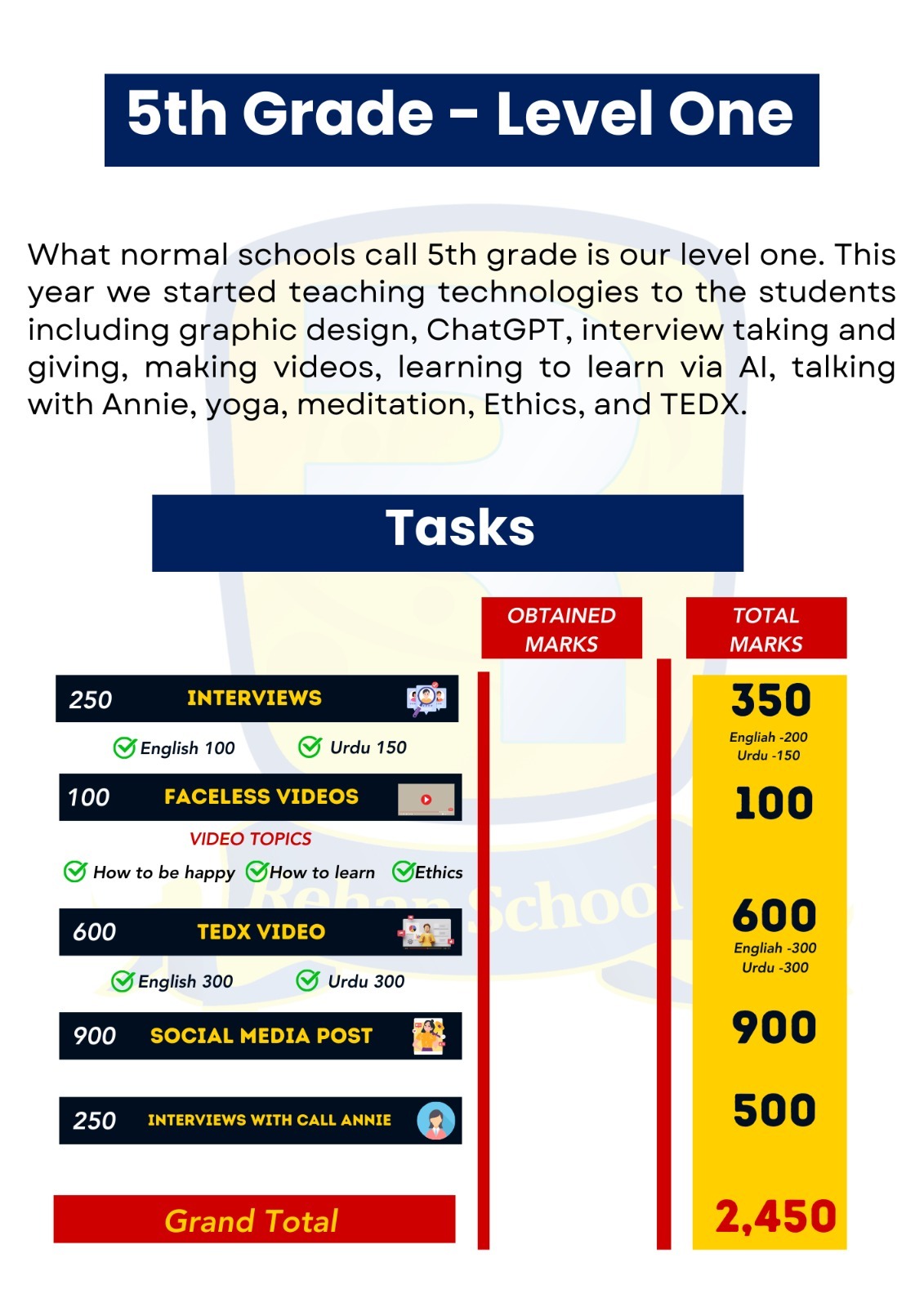 What normal schools call 5th grade is our level one. In this year, we start teaching technologies to the student including graphic design, ChatGPT, interview taking and giving, making videos, learning to learn via AI, talking with Annie, yoga, meditation, ethics, TEDx.