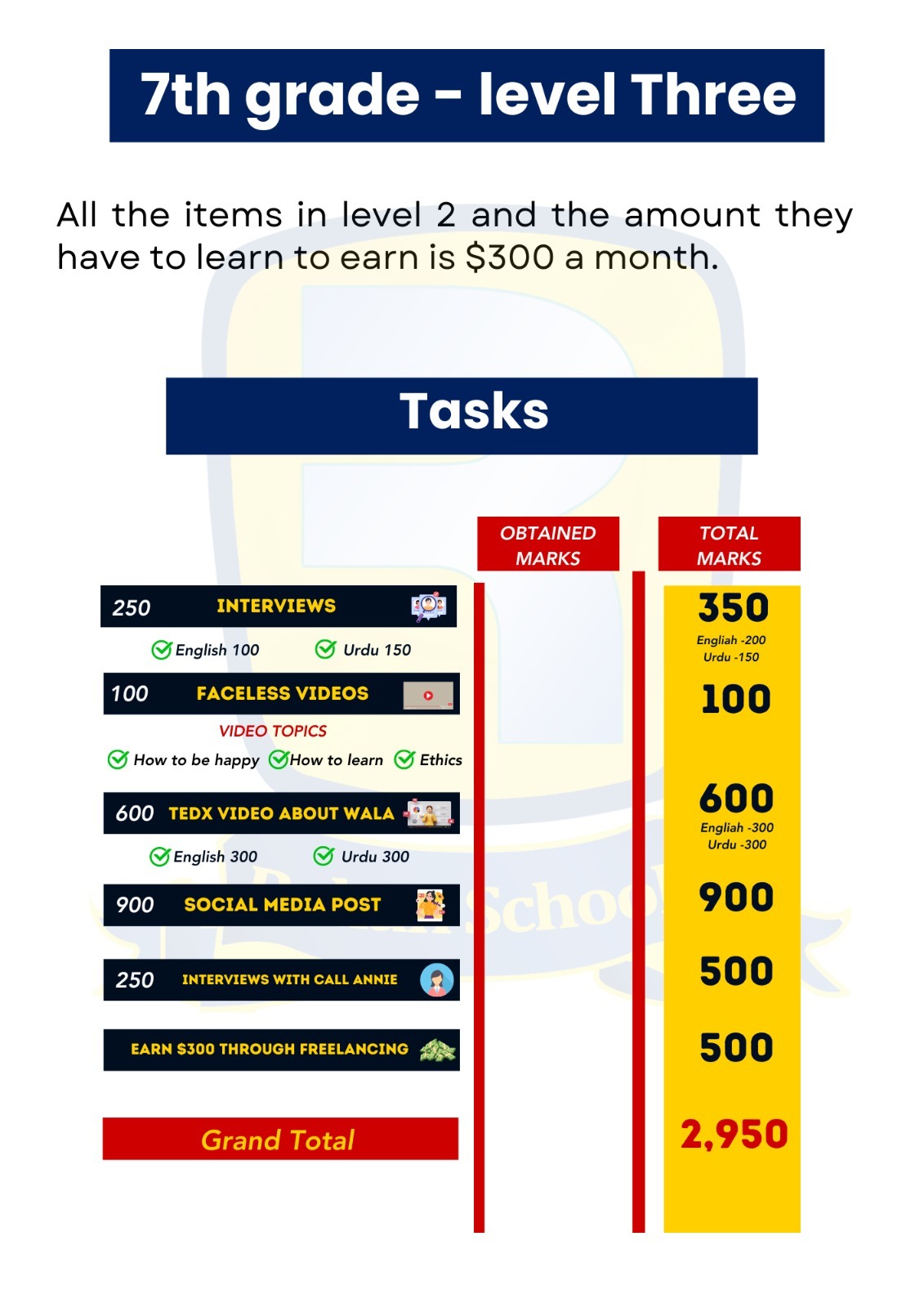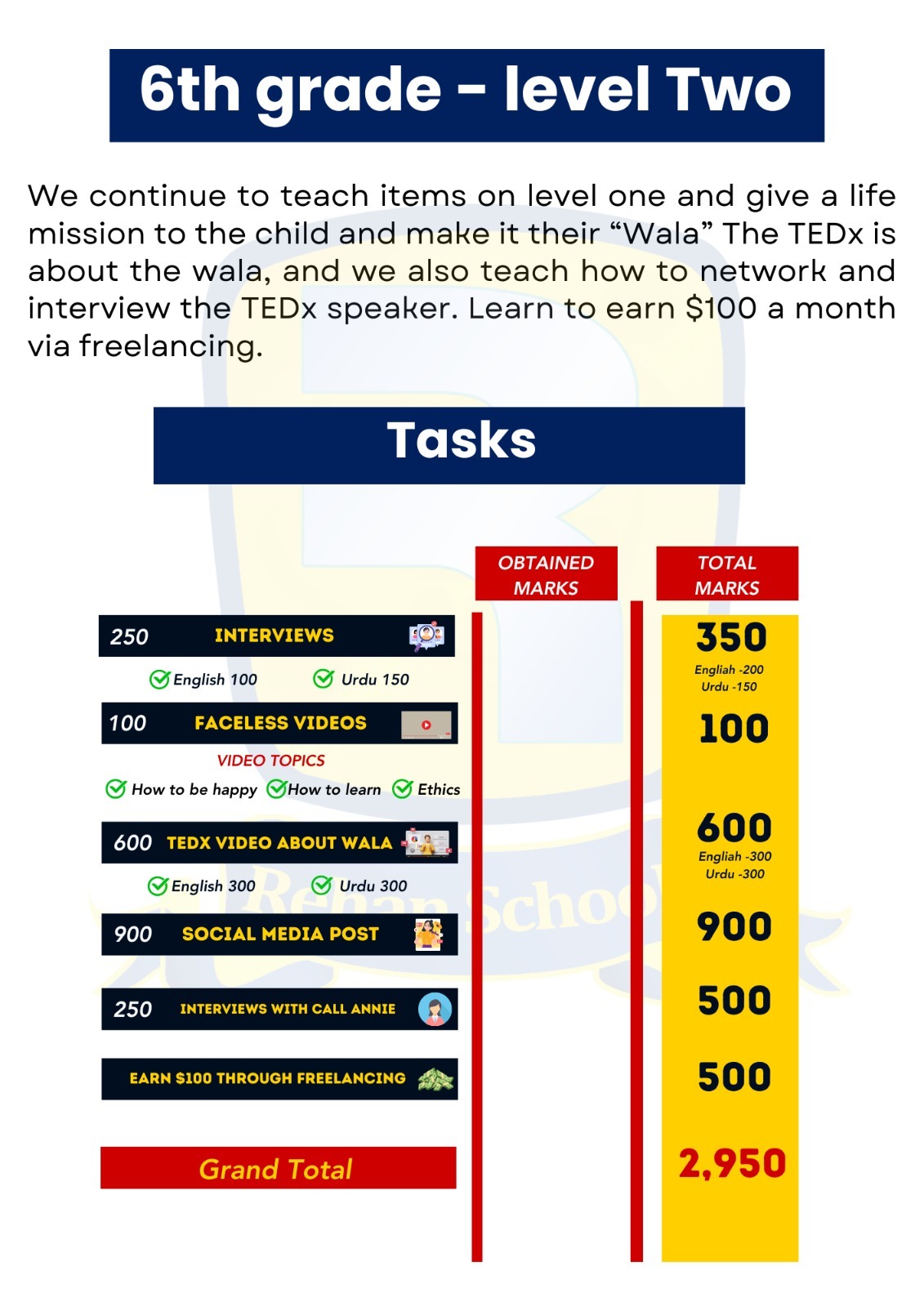 We continue to teach items from level one give a life mission to the child and make it their “Wala.” The TEDx talks are about the wala, and we also teach how to network and interview the TEDx speaker. Learn to earn $100 a month via freelancing.